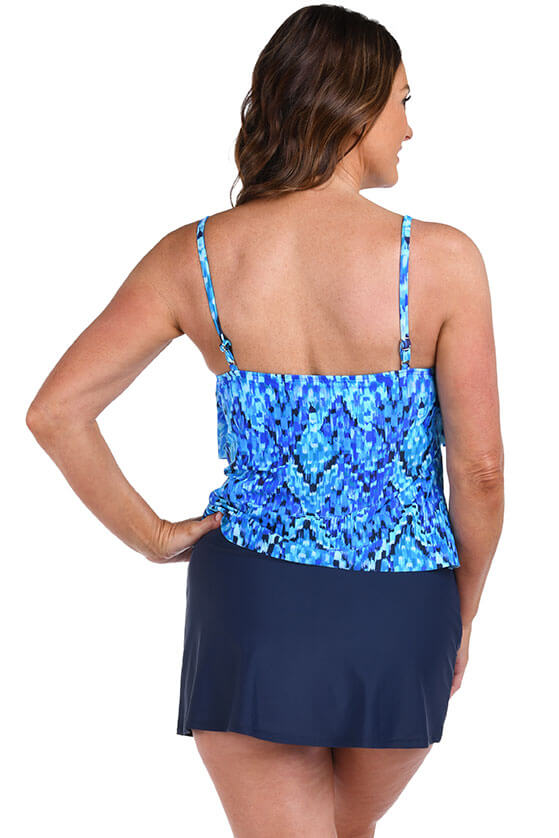 Turn heads with this Maxine double-tier tankini top! Featuring adjustable shoulder straps and a pointed handkerchief hemline, this top offers a stylish fit. The eye-catching ocean blue ikat pattern adds a fashionable, beachy flair.