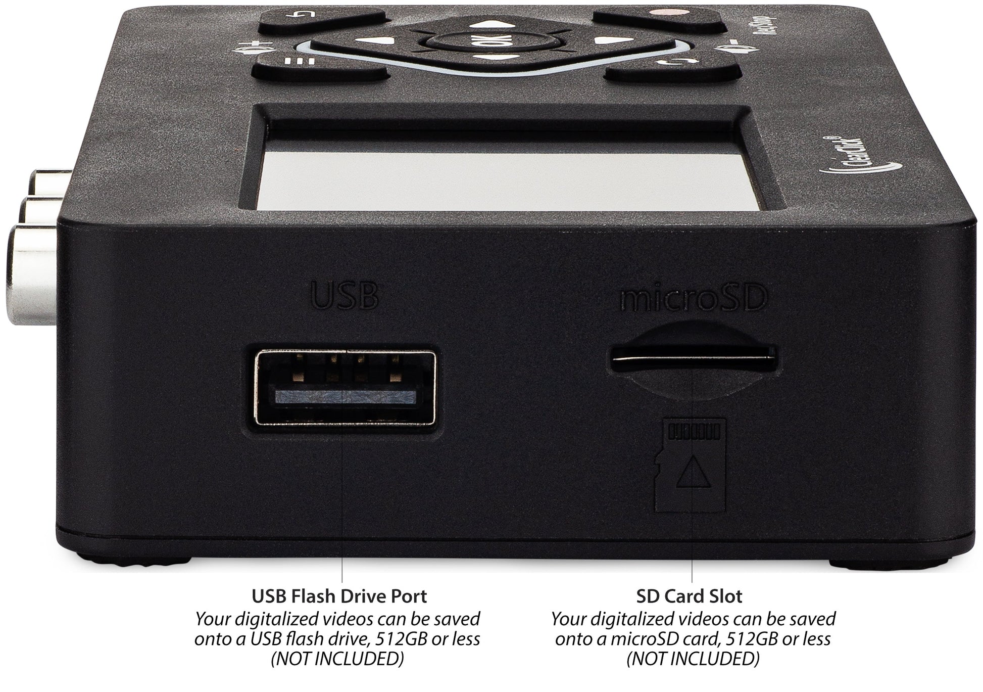 - Plug in a USB flash drive or MicroSD card (NOT INCLUDED; 512 GB or less) into the converter. Your digitized video will be saved onto this drive.