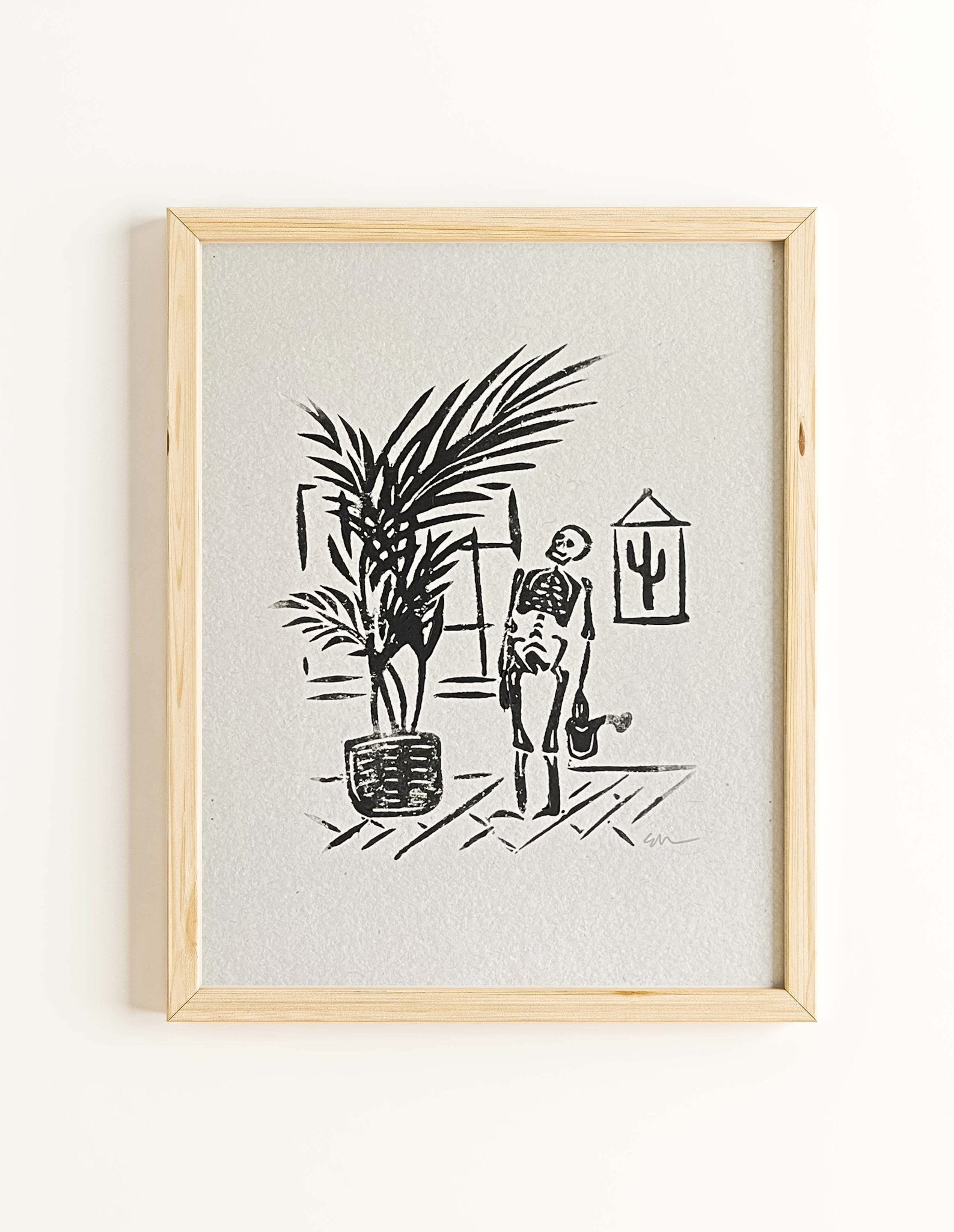 An 8x10” hand-carved linocut print depicting a skeleton watering a plant. Printed with oil-based inks on 150gsm French Paper Kraft-Tone paper in standard white. Each print is signed and numbered. Frame not included.
